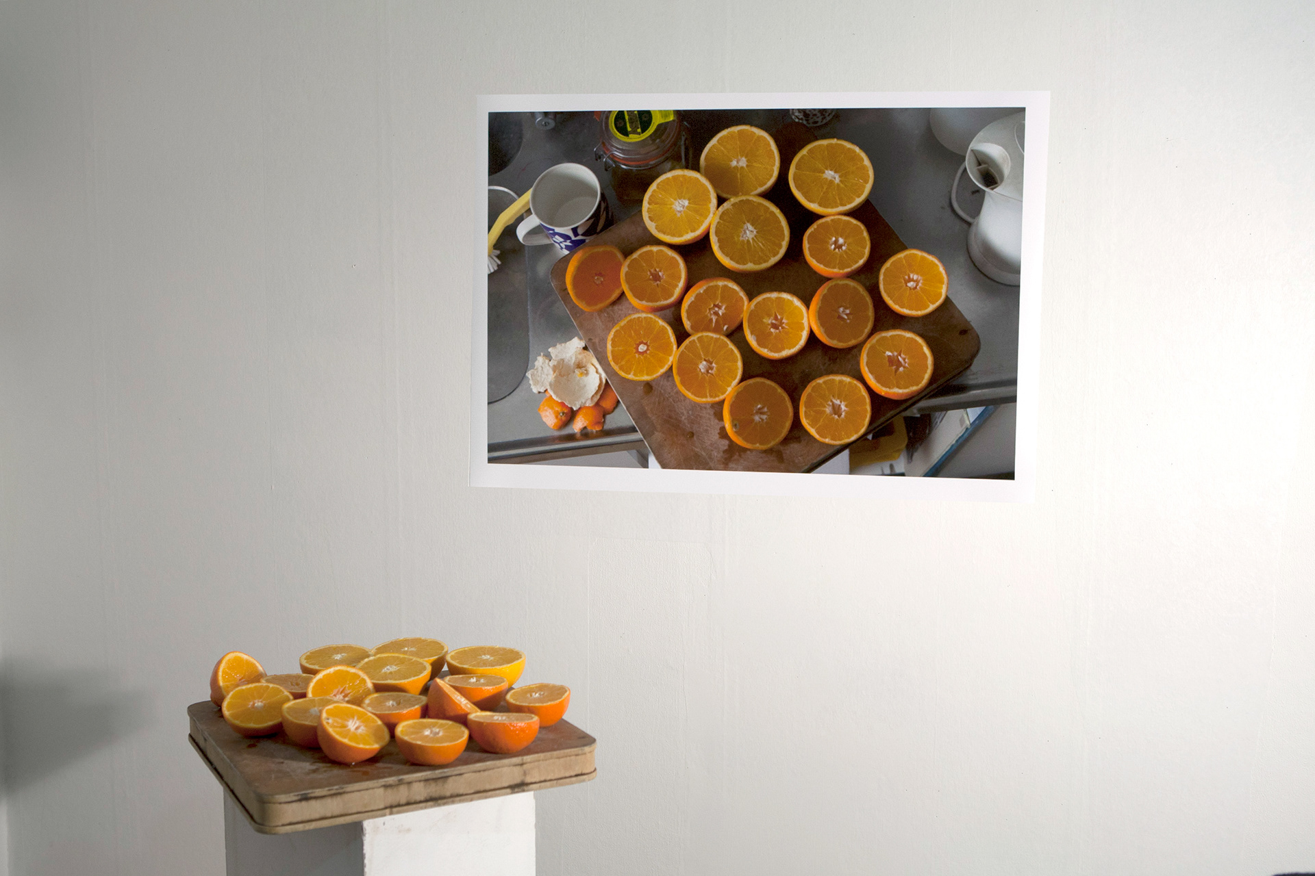 Archival pigment print, oranges and wooden base.